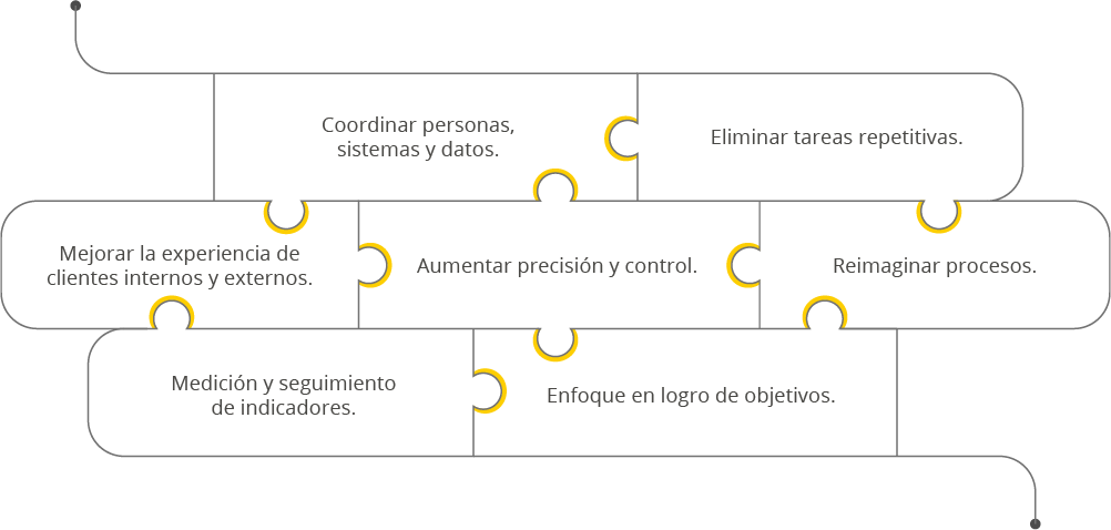 Somos aliados estratégicos en la transformación y la automatización de procesos y ayudamos a que tu organización opere con precisión, visibilidad y control, liberando el potencial de tus equipos para escalar con confianza.